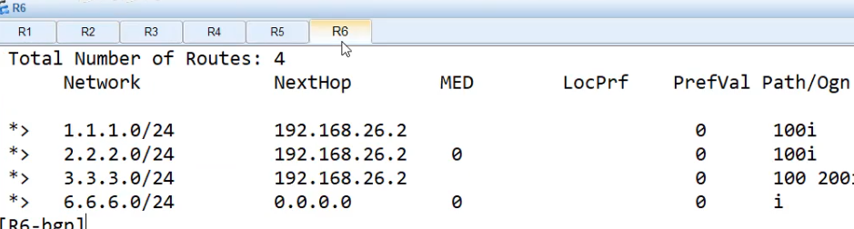 R1: bgp 100 roruter-id 1.1.1.1 peer 192.168.13.3 as-n 200 peer 192.168.14.4 as-n 300 peer 192.168.12.2 as-n 100 peer 192.168.12.2 next-hop-local net 1.1.1.0 24 R2: bgp 100 router-id 2.2.2.2 peer 192.168.25.5 as-n 400 peer 192.168.26.6 as-n 500 peer 192.168.12.1 as-n 100 peer 192.168.12.1 next-hop-local net 2.2.2.0 24 R3: bgp 200 router-id 3.3.3.3 peer 192.168.13.1 as-n 100 net 3.3.3.0 24 R4: bgp 300 router-id 4.4.4.4 peer 192.168.14.1 as-n 100 net 4.4.4.0 24 R5: bgp 400 router-id 5.5.5.5 peer 192.168.25.2 as-n 100 net 5.5.5.0 24 R6: bgp 500 router-id 6.6.6.6 peer 192.168.26.2 as-n 100 net 6.6.6.0 24