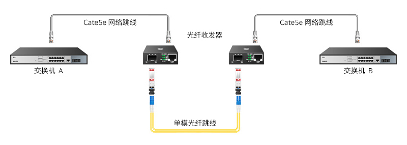 总之,光纤收发器在网络中的应用灵活且高效,掌握其连接方法和注意事项,能够有效提升网络性能和稳定性。遇到问题时,通过系统排查和解决,确保设备的正常运行。若问题复杂难以解决,及时联系供应商获取专业支持,是保障网络稳定的关键。光纤收发器 可以轻松的将基于铜缆的布线系统集成到光纤布线系统,具有较强的灵活性和较高的性价比。通常情况下,它们可以将电信号转换为光信号(反之亦然)来延长传输距离。那么,如何在网络中使用光纤收发器并将其正确地连接到交换机,光模块等网络设备呢?本文将为您详述。 如何使用光纤收发器? 如今, 光纤收发器 已广泛应用在各行各业中,包括安全监控,企业网,园区局域网等。光纤收发器体积较小,占用空间小,所以它们非常适合部署在空间有限的配线间,机箱等地方。尽管光纤收发器的应用环境不同,但是连接方法在本质上是完全相同的,下面描述了光纤收发器的常用连接方法。 单独使用 通常情况下,光纤收发器在网络中都是成对使用的,不过有时也需要单独使用将铜缆布线连接到光纤设备。如下图所示,带有1个SFP口和1个RJ45口的光纤收发器是用来连接两个 以太网交换机 ,其中,光纤收发器上的SFP口是用来与交换机A上的SFP口相连,RJ45端口是用来与交换机B上的电口相连,连接方法如下: 1.使用UTP线缆(Cat5以上的网线)将交换机B的RJ45端口与光纤收发器上的电口相连。 2.将SFP光模块插入光纤收发器上的SFP口,然后将另一个SFP光模模块插入交换机A的SFP口。 3.再将光纤跳线插入光纤收发器和交换机A上的SFP光模块中。
