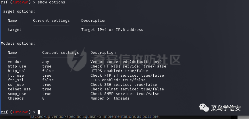 sudo ./rsf.py //开启routersplot use scanners/autopwn //执行自动扫描模块 show option //查看设置