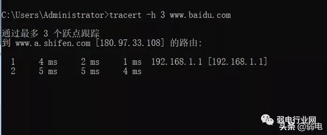 例4、“tracert -h 3 baidu.com”代表本次tracert搜索的最大跳数。