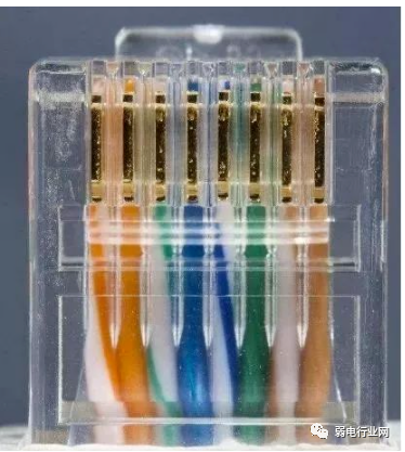 六类线8根线芯上下交错排布,排线孔较大,前部触点上部有三个分叉,压接进线芯后接触面积较大,常用于千兆网络,同时向下兼容百兆网络。