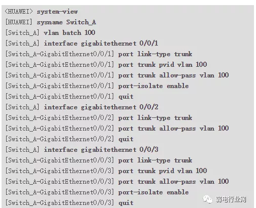 1、配置Switch_A的接口GE0/0/1~GE0/0/3都加入VLAN100(管理VLAN)。