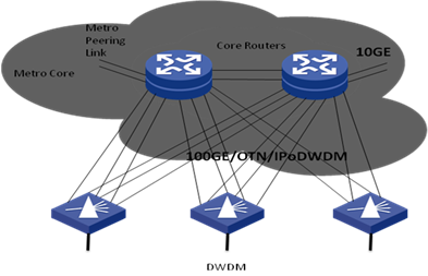 网络架构的扁平化也大大促进了40、100G高速接口的发展(图2)。新一代互联网对核心路由器提出了更高端口密度和更高速率上行接口的要求。40G、100G的接口需求是现实和迫切的。在下一代传输网OTN的架构中,以太网成为100G速率下唯一的实现标准,从这个意义上讲,以太网已经不再局限在“局域网和城域网”,而是真真切切“跑”到了骨干网上,成为“运营商以太网”。