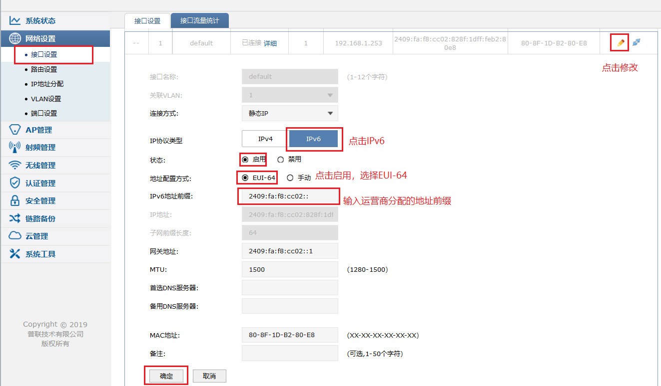 1. 配置路由器上网,路由器WAN口获取到运营商分配的IPv6地址。