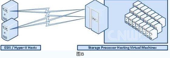 在小负载虚拟化的过程中,管理员可能有机会将一部分服务器合并到VMware或Hyper-V集群中。对于虚拟服务器来说,最关键的设计模式就是实现存储共享;但是,对于小型服务器集群来说,使用光纤通道交换设备显然是对投资的浪费。在这里的小型服务器集群,我指的是有两台或者三台VMware或Hyper-V主机组成的服务器集群。从整体角度来看的话,对于10到80台虚拟机的小型服务器集群来说,这可能是最容易被接受的虚拟化设计方案。典型的配置如下面的图A所示: