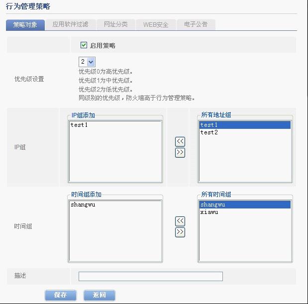 在保存公告内容后,需要进一步调整策略对象。在“策略对象”界面中,勾选“启用策略”,并选择相应的IP组和时间组。这一步的设置确保公告只在设定的时段和针对特定的用户群体显示。