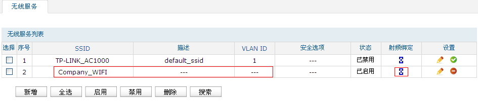 将设置好的SSID射频绑定到所有AP上,如下图: