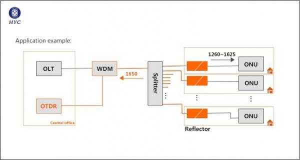光纤反射器的工作原理主要是利用光纤光栅将OTDR发来的测试光脉冲以接近100%的反射率反射回去,而正常的无源光网(PON)系统工作波长由于不满足光纤光栅布拉格条件则以很小的衰减通过反射器。这样做的主要作用是,通过检测反射回来的OTDR测试信号是否存在以及光信号的强度,可以精确的计算出每个ONU分支末端反射事件的回波损耗值。从而判断从OLT侧到ONU侧中间的光链路是否正常。这样就实现了对故障点的实时监测以及快速精确的诊断。