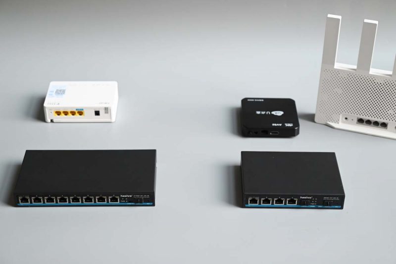 我们可以使用两台2.5G网管交换机进行测试,例如hasivo的“4+2”和“8+1”型号。将一台交换机放在弱电箱中,另一台放在客厅的电视柜处。客厅交换机的4+2或5+1网口足以满足需求,如果不够用,还可以插入主路由器。