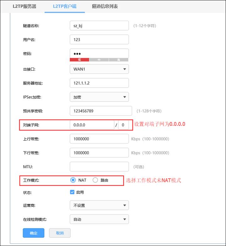 在VPN客户端路由器界面,点击“VPN—PPTP—PPTP客户端”,点击设置VPN条目,设置对端子网为0.0.0.0/0,工作模式设置为NAT模式。