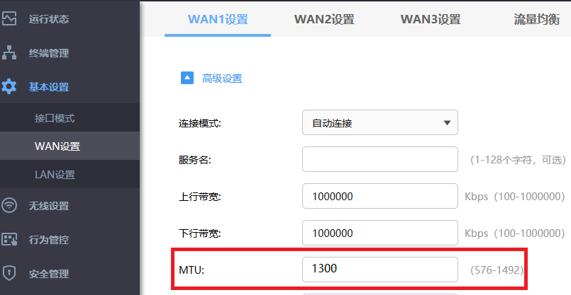 第二步,修改路由器MTU值。MTU(最大传输单元)的中文意思是最大传输单元,如同高速公路对行驶速度有限制的原理,网络中对传输的数据包大小有限制。部分宽带运营商可能没有按照国际标准设置MTU值,导致较大的数据包无法通过。通过路由器WAN口设置中的高级设置,将MTU值改小(如改为1300)即可快速解决此类问题。