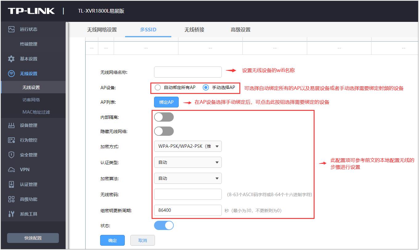 在开启设备集中管理后,您可以对设备进行无线Wi-Fi绑定。进入“无线设置”选择“多SSID”,可以设置多个无线名称,并为相应的设备(如AP或易展设备)绑定无线参数。如果想要设备发射的无线与路由器一致,只需在路由器自身的SSID条目绑定对应设备即可。