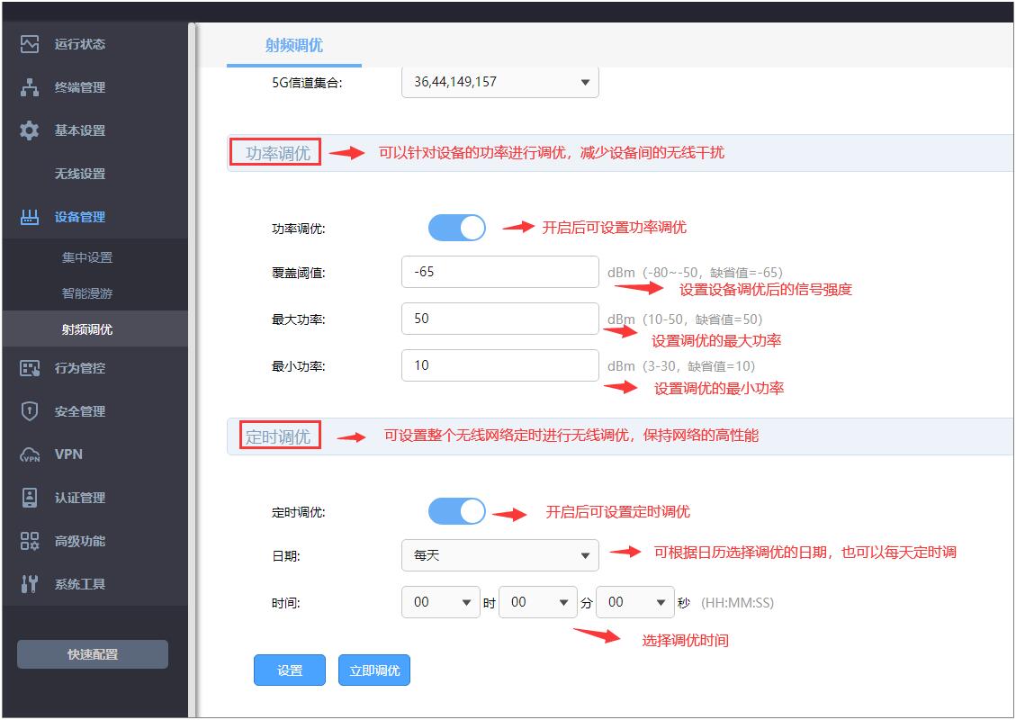 点击【设备管理->射频调优】,根据需求开启信道调优、功率调优和定时调优,如下图: