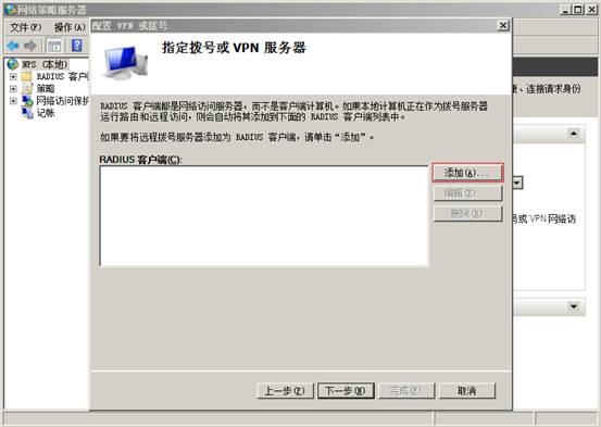 选择“拨号连接”,点击“下一步”。进入“指定拨号或VPN服务器”,在RADIUS客户端选项中点击“添加”。