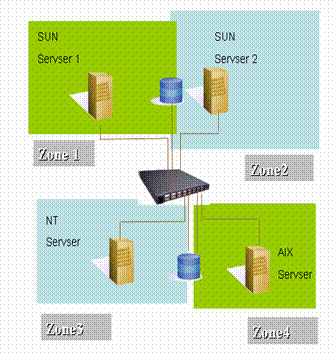 在早期的SAN方案中,服务器大多是同种操作系统,SAN环境下的安全性问题并不突出。但是现在的方案中,异种操作系统并存的需求比比皆是,多套磁盘阵列子系统或具有多个主机接口的磁盘阵列子系统也很常见。为了保证SAN正常工作,不互相破坏数据。基于FC存储交换机层面的Zoning 分区划分,可以有效提供一种解决方案。这样服务器只能访问同一分区内的设备,提高设备访问的安全性。