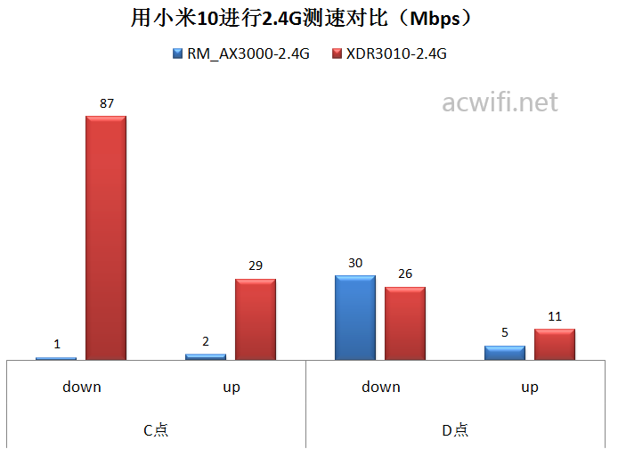 楼上三个位置,XDR3010明显快于红米AX3000,在楼下D点位置相差不明显。