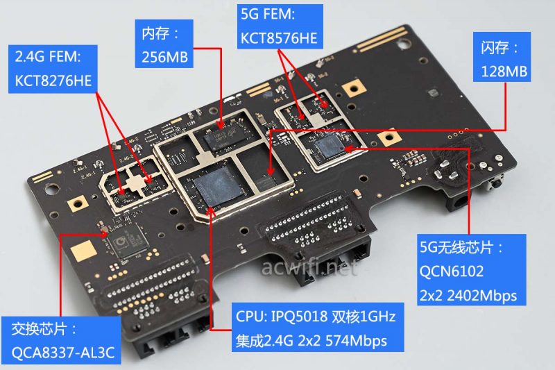 拆解路由器,我们可以看到,它采用了高通IPQ5018处理器,双核1GHz,集成单核1GHz NPU,支持2.4G Wi-Fi 6(2x2MIMO 574mbps)。在内存方面,它配备了256MB DDR3-1600内存,以及128MB的闪存。此外,2.4G和5G射频电路分别采用KCT8276HE和KCT8576HE芯片,支持2x2MIMO,在160MHz频宽下最高速率可达2402Mbps。