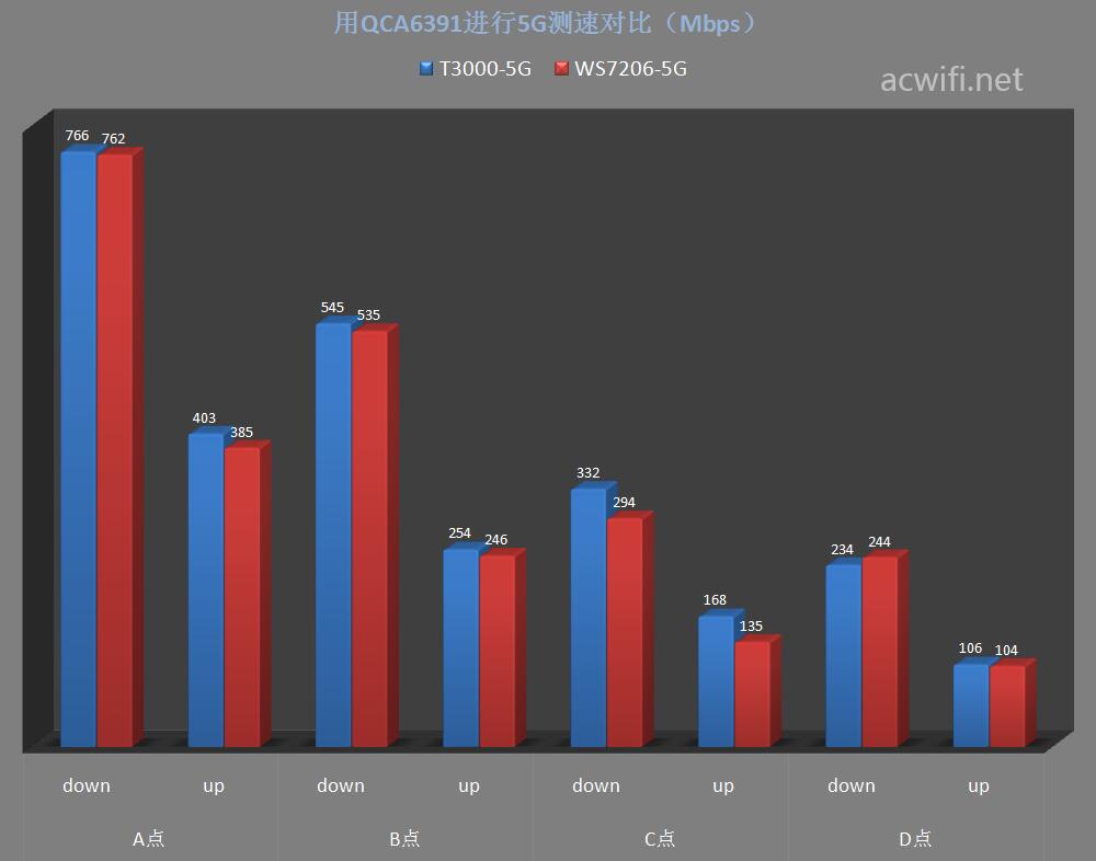 高通这款QCA6391无线网卡,在同一楼层的三个位置里,上、下行速度均是中兴AX3000 Pro快一点点,在楼下D点逊色一些,不过差距不明显。