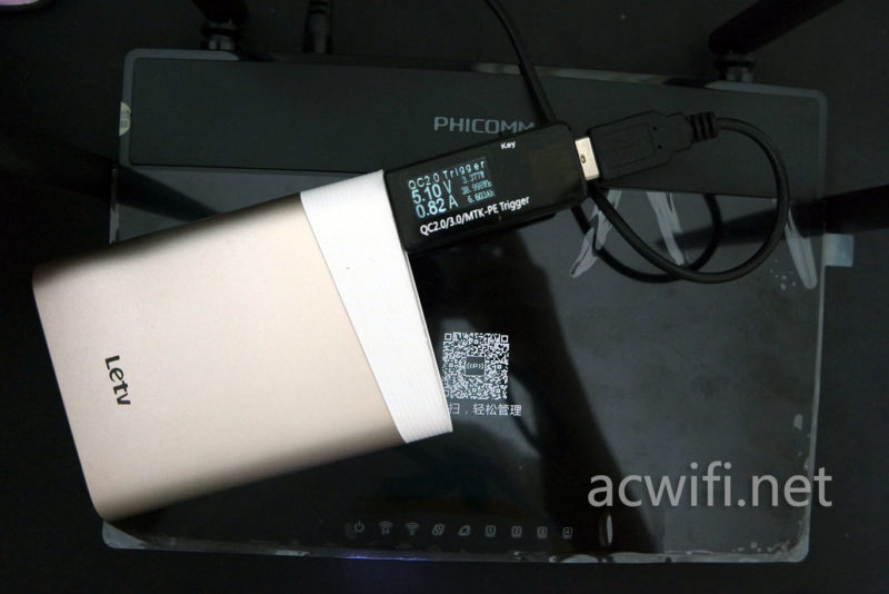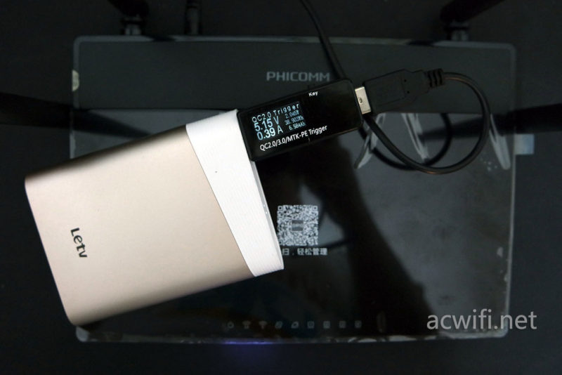 再来,今年都比较热门的免费路由”斐讯K2“,它也是12V电压,而且配的适配器是12V 1.5A的,可以看看这电源的介绍。用移动电源的5V电压直接插K2的电源口,路由的指示灯红色,但就是一直是红色,启动不了,手机查看无线wifi,没看到K2的SSID,过了几分钟也是依旧,不能启动。用诱骗器让诱出9V电压,接到K2上,能正常启动了。斐讯K2的待机功耗是2.4W,不高,因为是MTK的芯片,都低功耗。发热量也不算大。