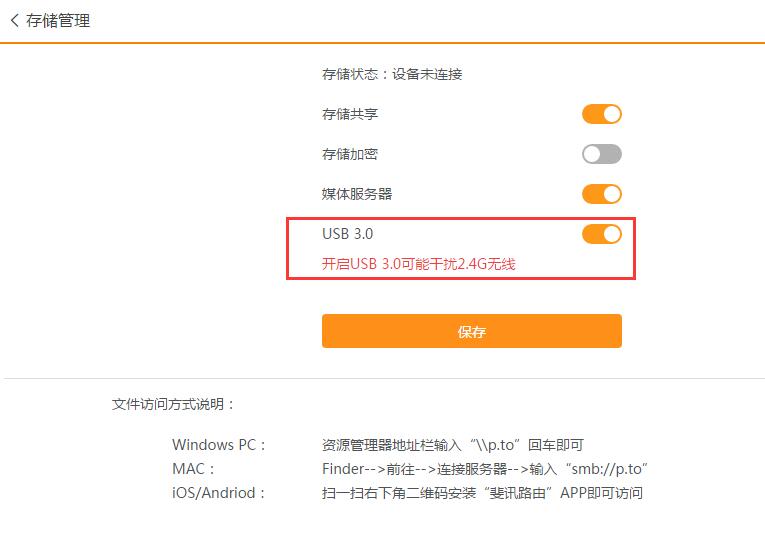 先来测斐讯K3上面的USB接口吧。目的是要测试USB3.0的速度,所以要在K3路由设置里,把这个USB3.0开启。如下图