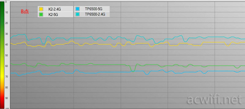 B点。隔了2墙,TP6500的2.4G比K2强些,而5G侧是K2强些。