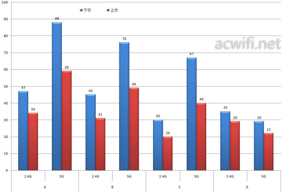 A位置,2.4G下行47.3MB/秒,上行34.5MB/秒; 5G下行速度88MB/秒,上行速度59.5MB/秒。