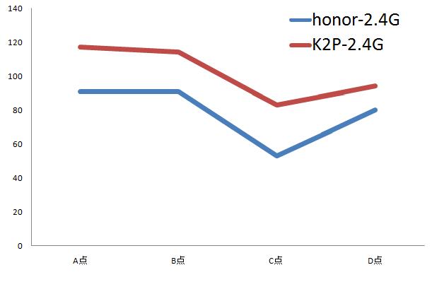 A点位置,K2P-2.4G要强一点,K2P的5G强得有点明显。