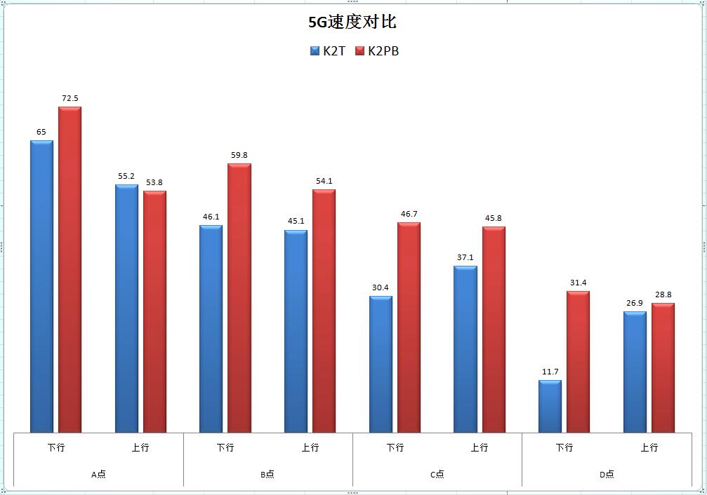 5G网速,在A和B点两者一样,在C和D两个位置,还是K2P金色版要比K2T快。