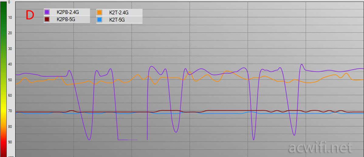 接下来,我们来看看传输速度。在2.4G频段,除了C点位置K2P金色版略快,其他位置两款路由器的传输速度差异不大。而在5g频段,A和B点位置两款路由器的传输速度相同,C和D点位置K2P金色版略胜一筹。