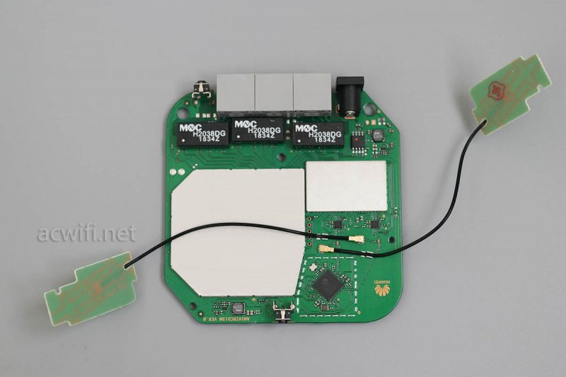 那么被焊死在屏蔽罩里面应该也是Hi1151无线芯片了,负责5G工作。(下图右上角),没有屏蔽罩的Hi1151负责2.4G工作,2.4G没有外罩功放。
