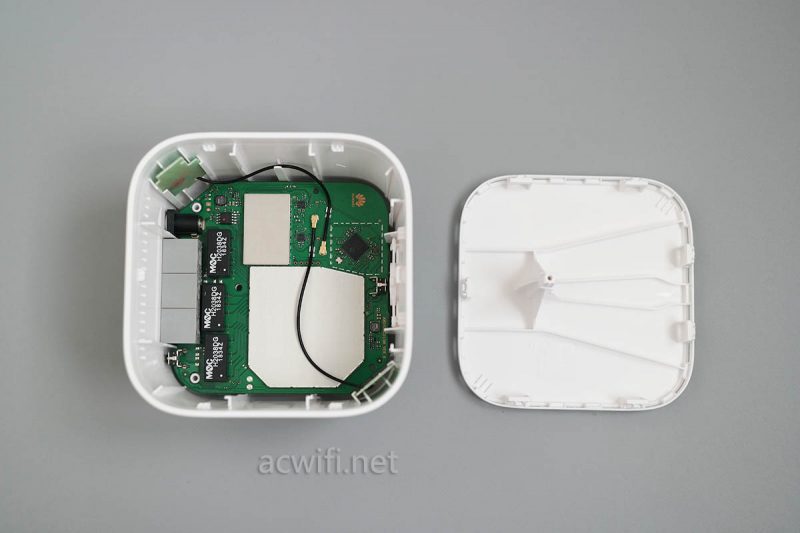 背面有三个网口,都是千兆速率,估计WAN和LAN口可以随意插拔,自动识别。但在自动识别的过程中,可能会消耗一定的时间。拆开底部标签时,我发现那四个孔位并非螺丝,而是连接金属散热片的卡口。拧下一个螺线后,可以撬开顶盖,看到主板。
