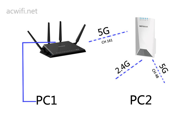 因为扩展器本身没有LAN口输出,更没有LAN口输入,所以它的2.4G或5G传输都要由R7800跟它的另一个5G负责。随便画个图吧,容易明白些!