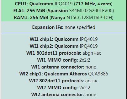 从上图中可以看见一些参数:四核处理器,MU-MIMO,这应该是IPQ4018/4019无疑了。从网上暂时找不到EX7500拆机图,不过wikidevi网站上可以查询到它的硬件配置信息: