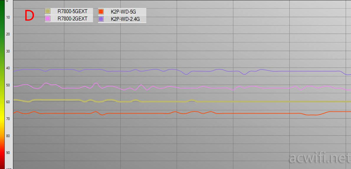 最后在楼下一层的D点位置,这里四条曲线分层很明显,2.4G强度一直是K2P较强,而5G是EX7500强。