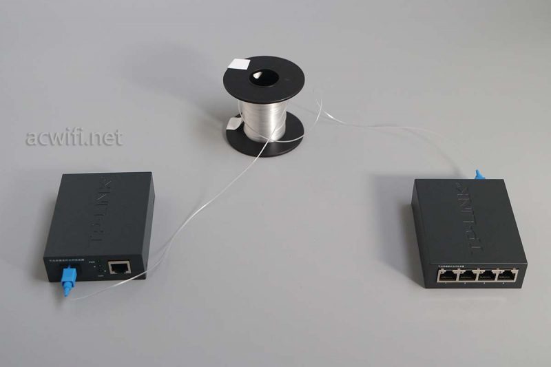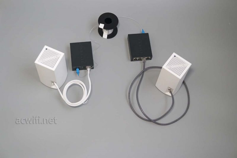 在相距9米远的房间里放着一台双频VELOP主节点,网口接在FC311A-3上,“A”与“B“接上光纤。主节点的WAN口接在自建speedtest服务器上。