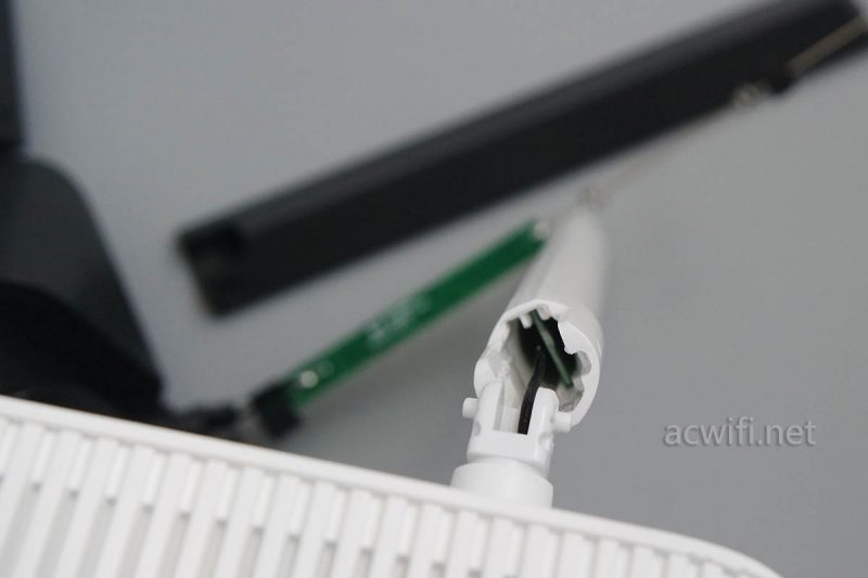 下图是红米AX6的天线,看见里面也是有PCB版,但我没办法把它取出来,嘴嘴钳够不着里面,有卡槽,被卡得很紧,我估计跟小米AX3600的天线一模一样。