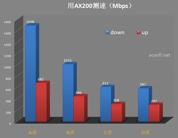 在隔了一墙的A点位置,测得超过1600Mbps的下行速度 。但随着距离的增加,速度也慢慢衰减。正常的现象!