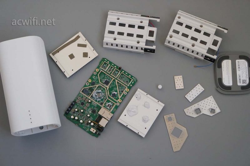 从拆机过程中,我们了解到该设备内置了 PCB 天线,共有五根天线。其中,2.4G 频段支持 2x2 MIMO,而 5G 频段支持 5x5 MIMO。此外,设备内部结构采用了大量金属屏罩和散热器,这表明它具有出色的散热性能。