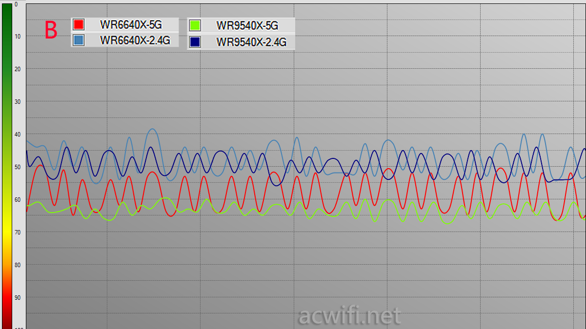 在隔了两墙的B点位置,两者的2.4G信号强度依然很接近,5G信号强度是WR6640X强一点;