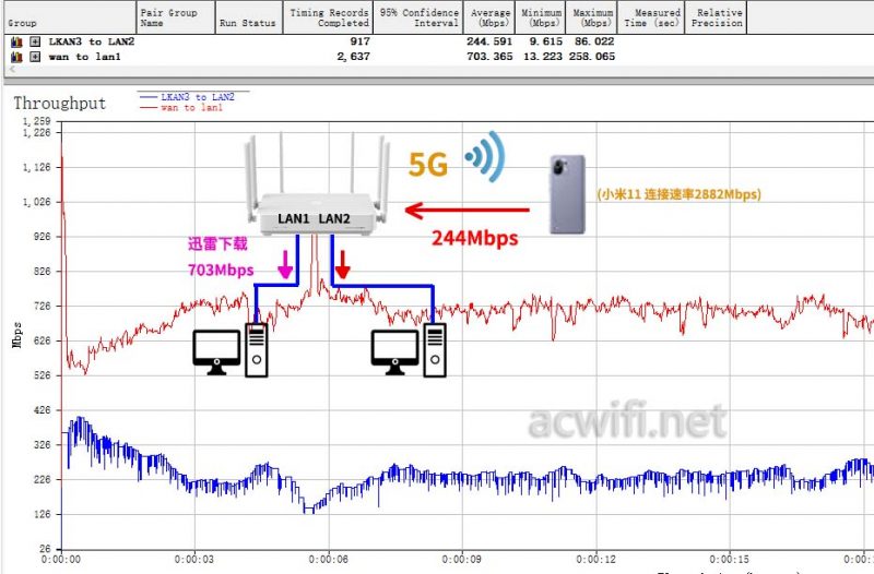 1、两个LAN口同时向小米11的5G发送数据