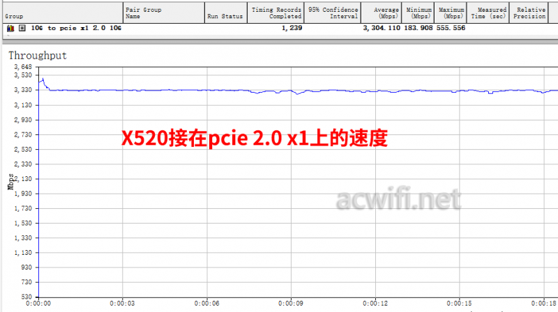 为了验证这一结论,我们使用X520万兆网卡通过X1转接线插到X1插槽上,此时传输速度为3304Mbps。这进一步证实了PCIe 2.0 x1在高速传输时的限制。