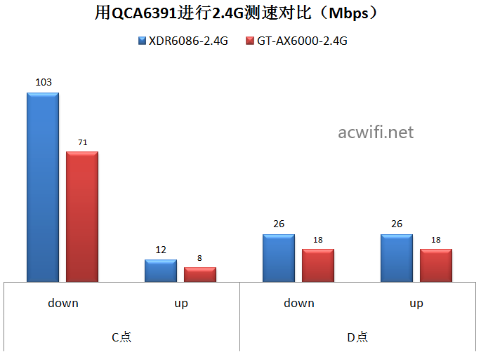 近距离下是华硕GT-AX6000快一些,楼下D点是XDR6086快一些。所有位置的上行速度是XDR6086要快一些。
