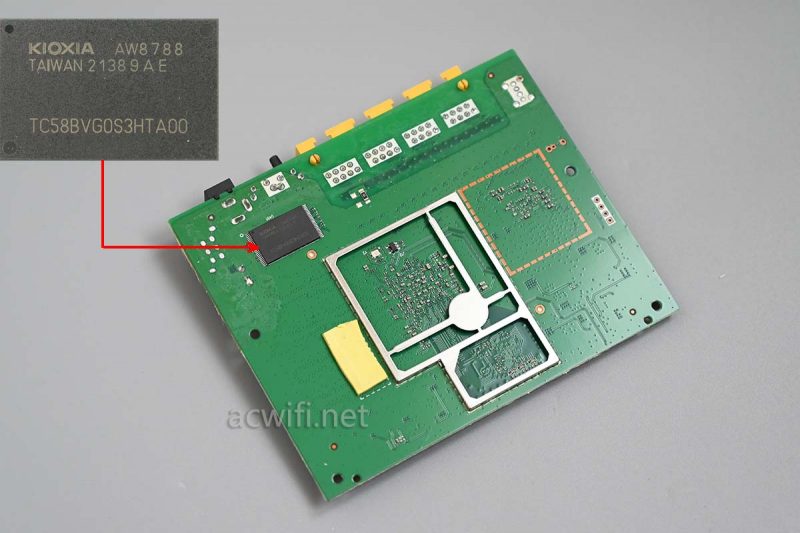有一颗闪存芯片,型号是TC58BVG0S3HTA00,容量128MB: