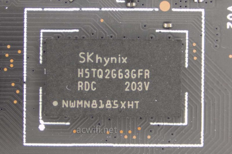 CPU旁边的内存芯片,型号是海力士的H5TQ2G63GFR-RDC,容量256MB的DDR3: