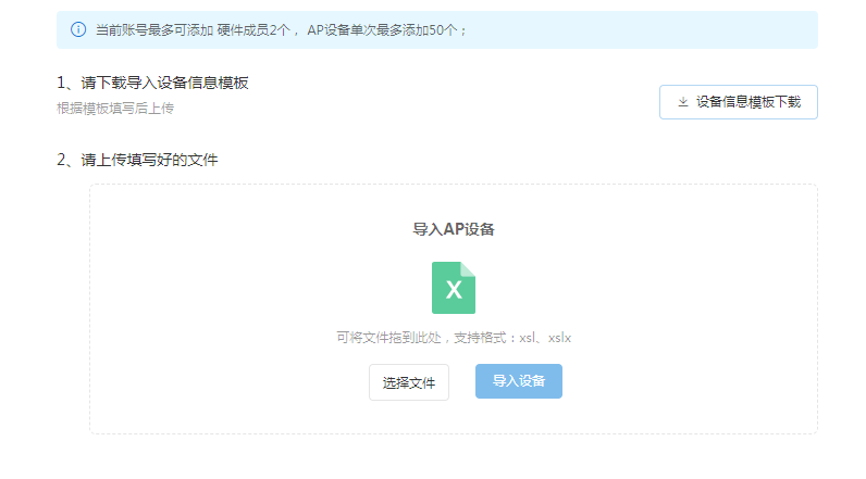 (6)点击【设备管理】->【设备列表】->【AP列表】->【添加设备】->【批量导入设备】,下载导入设备信息模板,按要求填写后上传,绑定设备后,步骤5中的无线配置就会自动下发给绑定好的设备;
