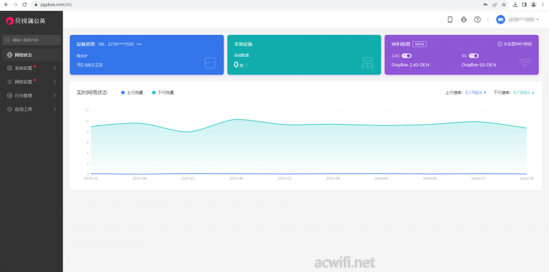 因为我没有贝锐蒲公英的网关,所以这台无线吸顶AP只能单独设置。要设置就先要联网才可以(把现有能上网的网络接网线至这台AP的WAN口就行)。管理页地址是pgybox.com。用机身上的SN码和默认密码admin登录。