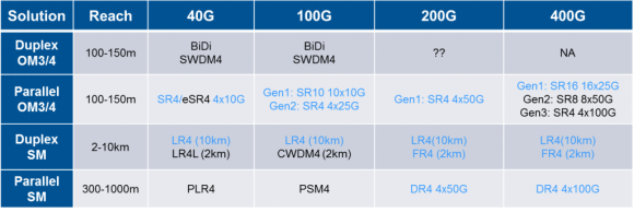 尽管双芯光纤和八芯光纤解决方案是未来的发展方向,但一些短期的替代方案也将提供不同的基本光纤数量。如上表所示,通往400G的路径,包括了作为base-32和base-16解决方案的第一代和第二代OM3/OM4并行传输建议。然而,与著名的收发器、交换机、服务器和存储供应商的讨论表明,由于制造成本和连接器的复杂性,这些解决方案不会得到广泛的部署。
