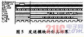 图5是发送模块的仿真结果,Tx_clk是来自PHY接口的发送时钟,s_out是帧以串行方式发送。最先发送的前导序列码,接下来帧起始分隔符,再就是数据位,最后是CRC检验位。