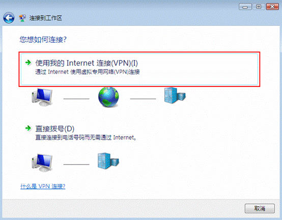 然后,在“您想如何连接?”页面中,请选择“使用我的Internet连接(VPN)”。这样,系统会为您建立一个VPN连接。