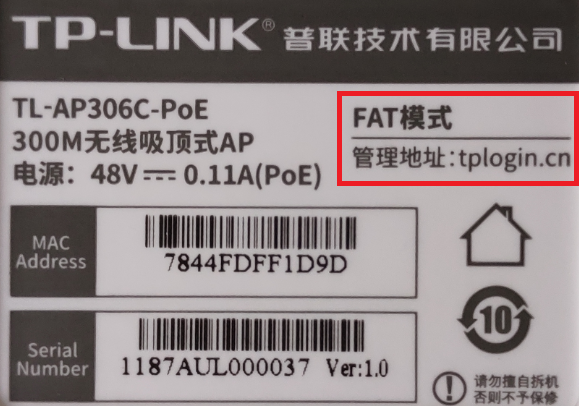 AP管理地址在AP产品标贴上有显示: